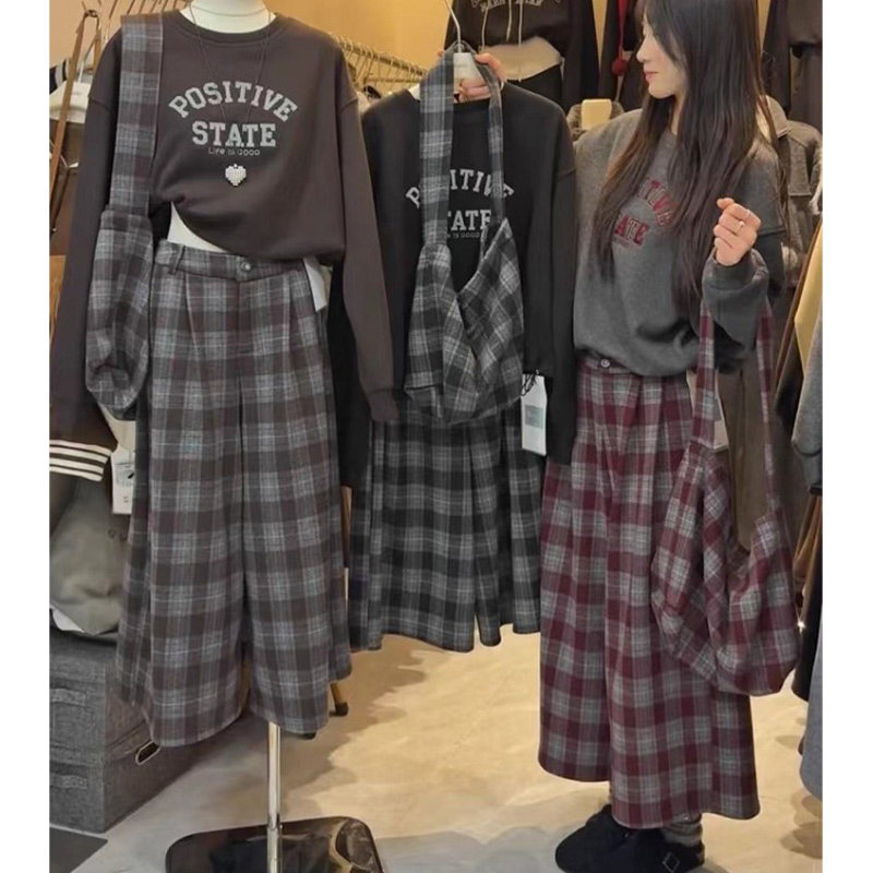 2025冬季新款韩版加厚刺绣字母卫衣高腰撞色格纹阔腿九分裤套装女