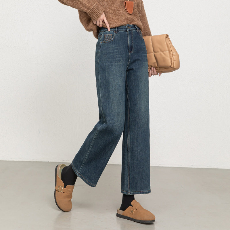 F16水洗棉牛仔裤女直筒秋冬季加厚韩版高腰宽松窄版阔腿裤九分裤