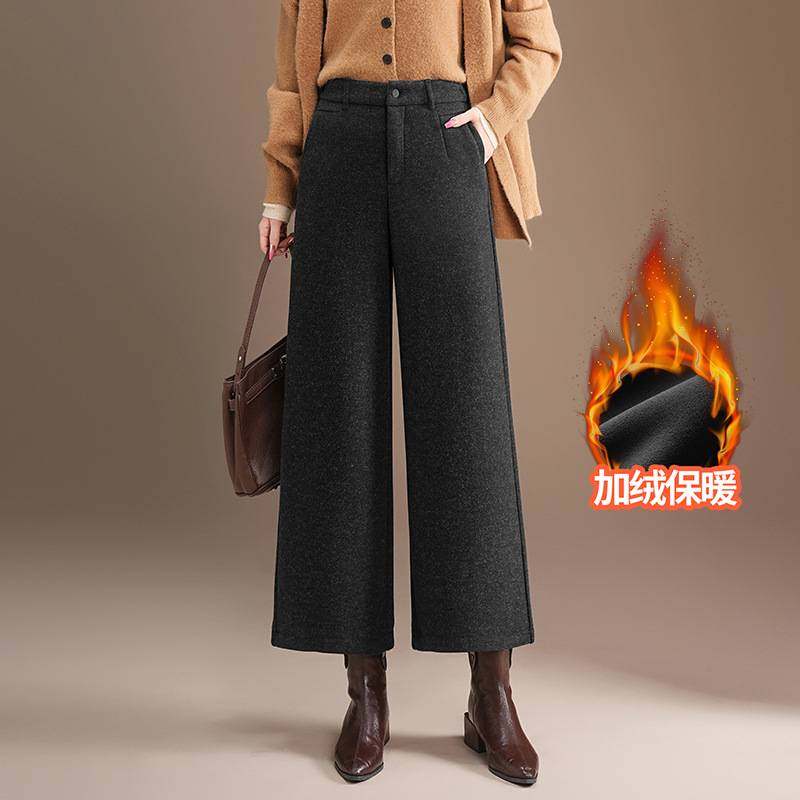 韩版简约宽松加绒休闲裤女2025冬季新款高腰显瘦加厚阔腿裤九分裤