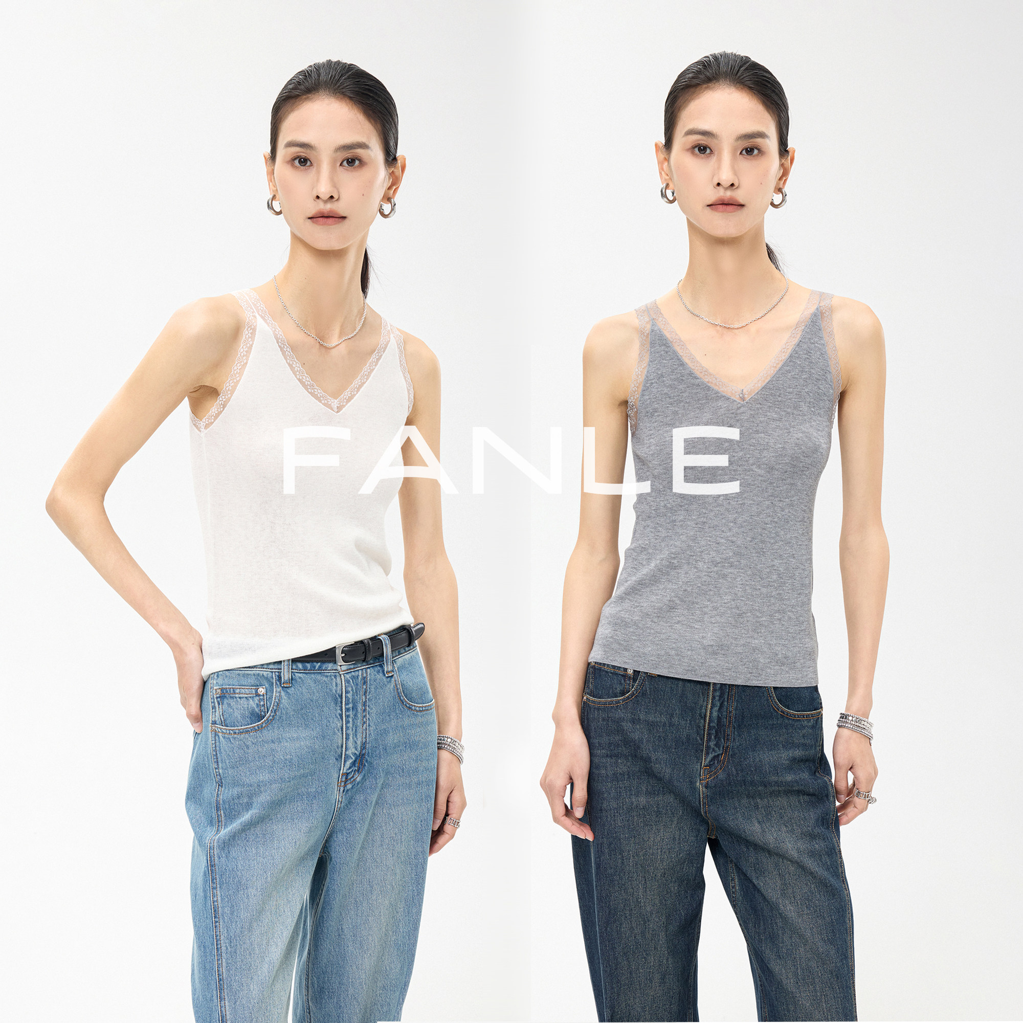 FANLE STUDIOS桑蚕丝山羊绒柔软透气双V领蕾丝拼接可外穿背心吊带