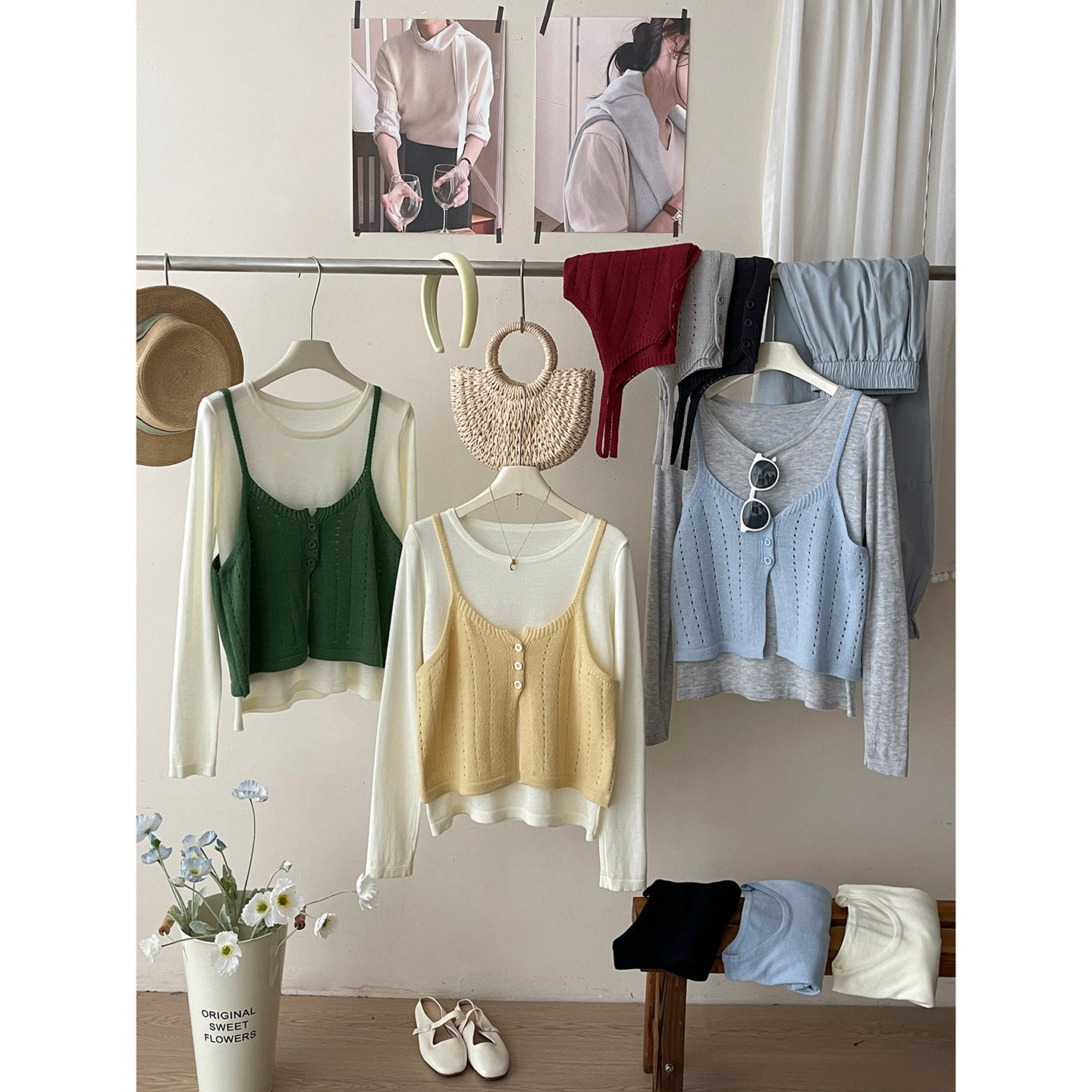 日韩系复古软糯混羊绒针织衫女春百搭叠穿吊带背心洋气两件套上衣