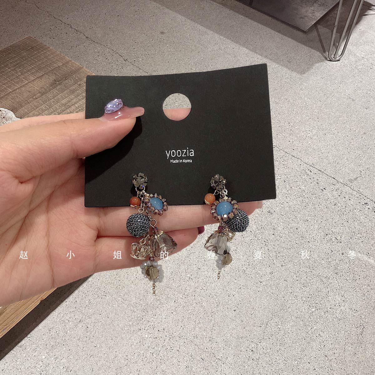 韩国饰品复古民族风蓝色流苏长款耳环高级感小众独特圆球水晶耳饰