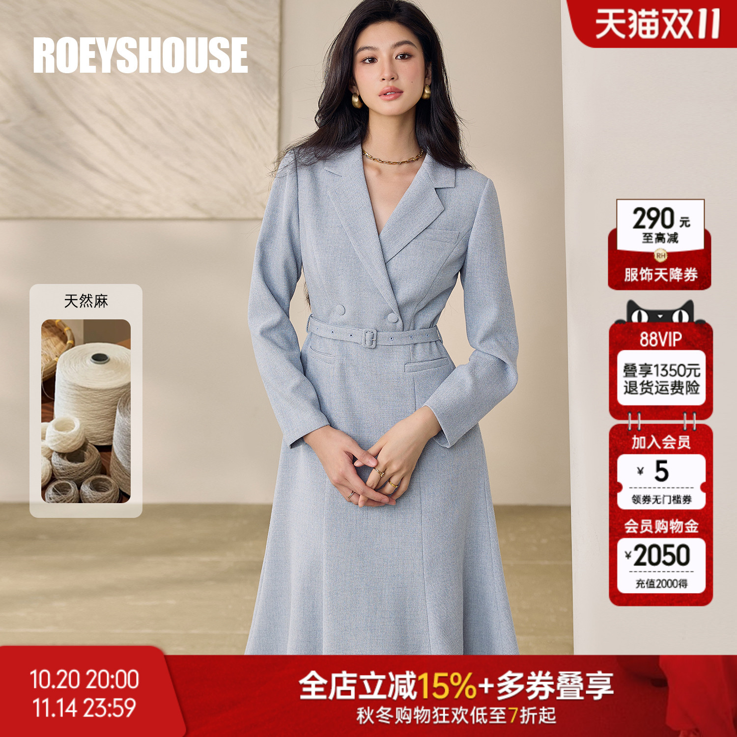 罗衣优雅系带浅蓝色西装连衣裙2025秋季新款时尚麻料中长裙12794