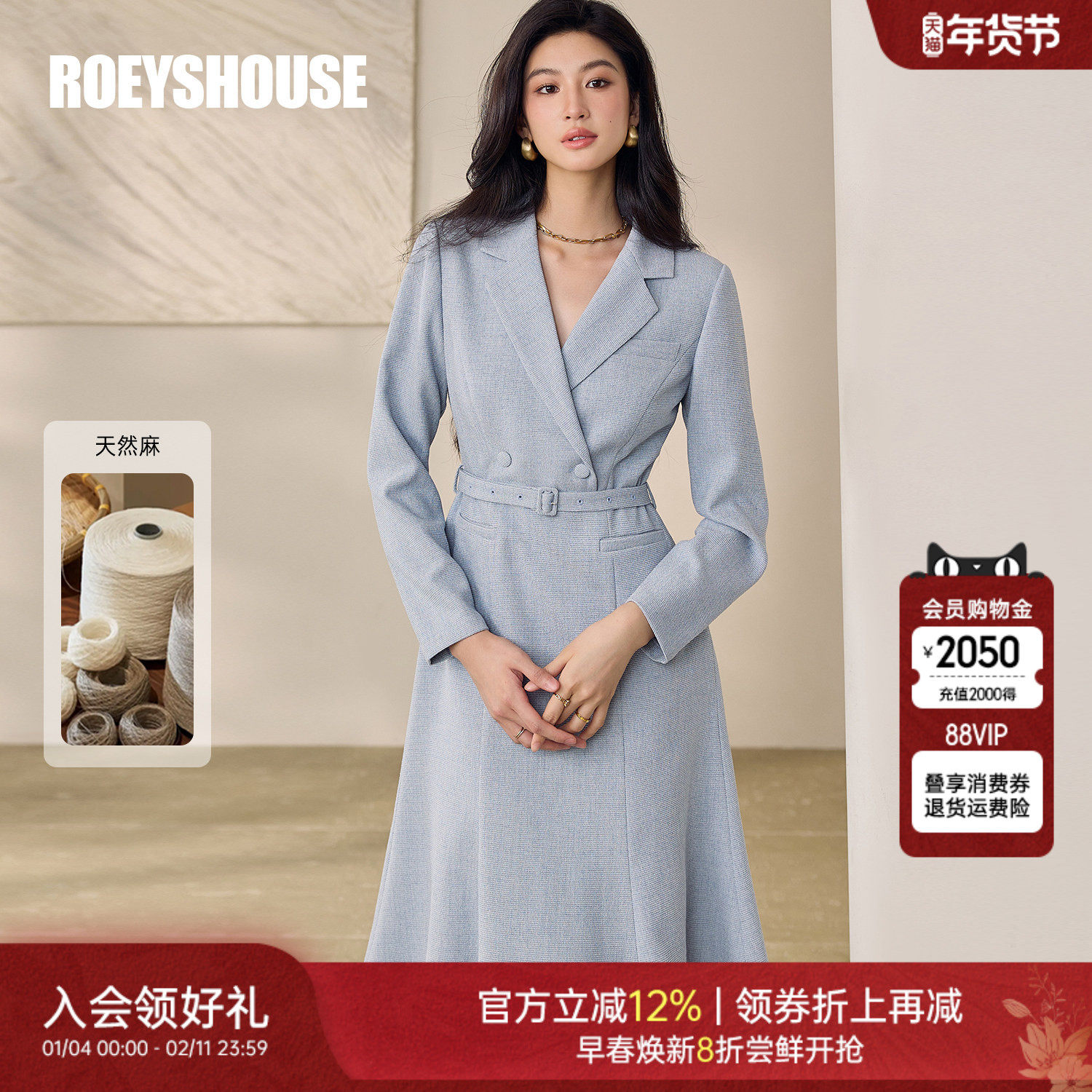罗衣优雅系带浅蓝色西装连衣裙女春季新款时尚麻料中长裙子12794