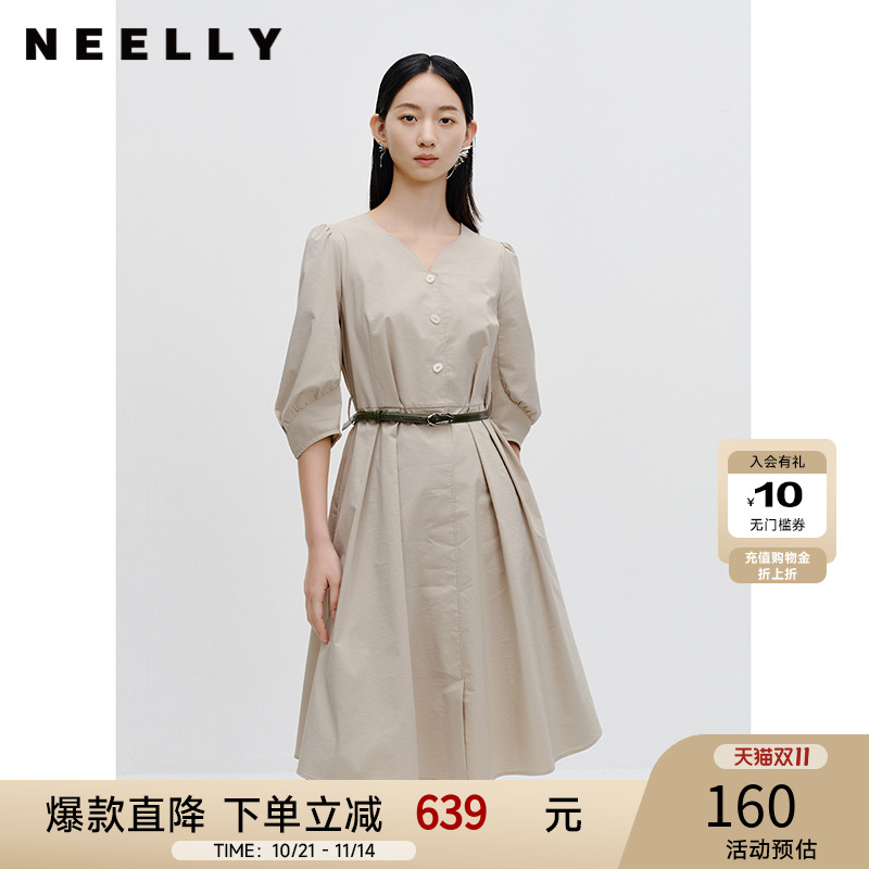 NEELLY纳俪商场同款秋季V领泡泡袖连衣裙女收腰系带a字裙中长款