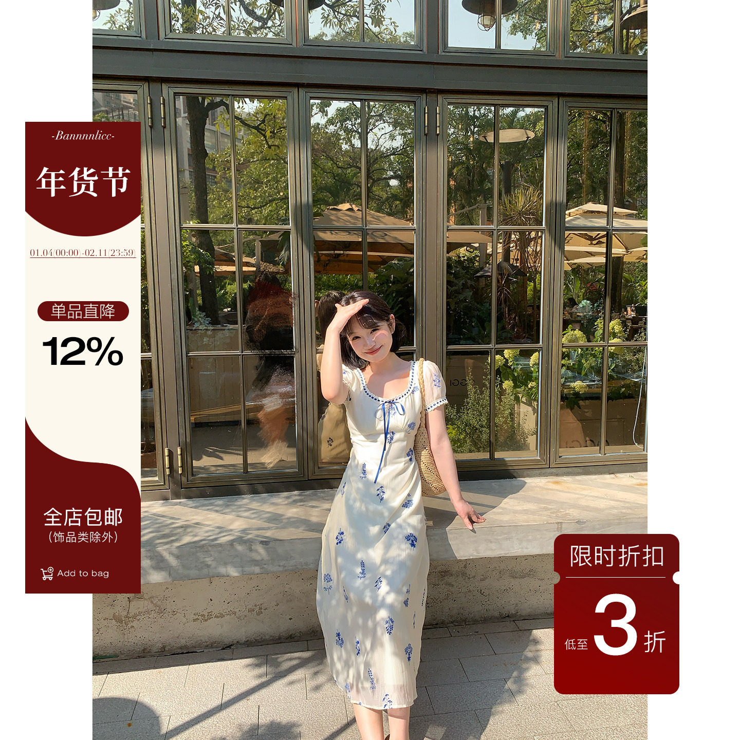 板栗西西【青花瓷韵】氛围感碎花刺绣方领系带收腰连衣裙夏中长款