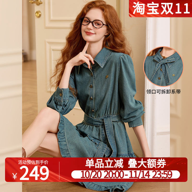 白鹿语木耳边蝴蝶结系带牛仔连衣裙25秋新款设计感减龄收腰中长裙