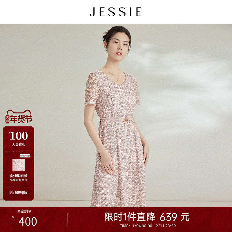 JESSIE粗花呢修身连衣裙女针织花纱立领系带束腰中长裙25年冬新款