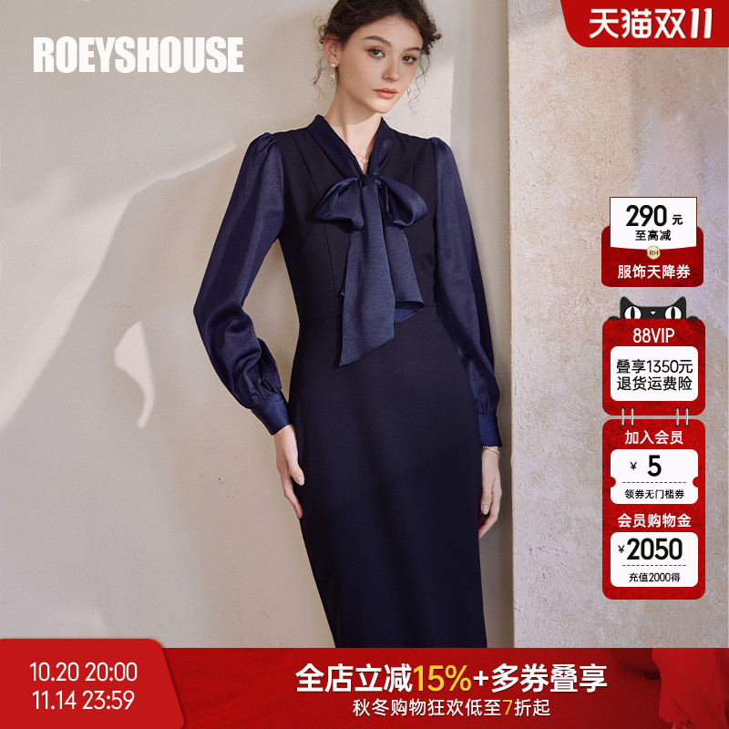 罗衣职业深蓝色连衣裙女2025秋季新款系带领拼接缎面中长裙08154