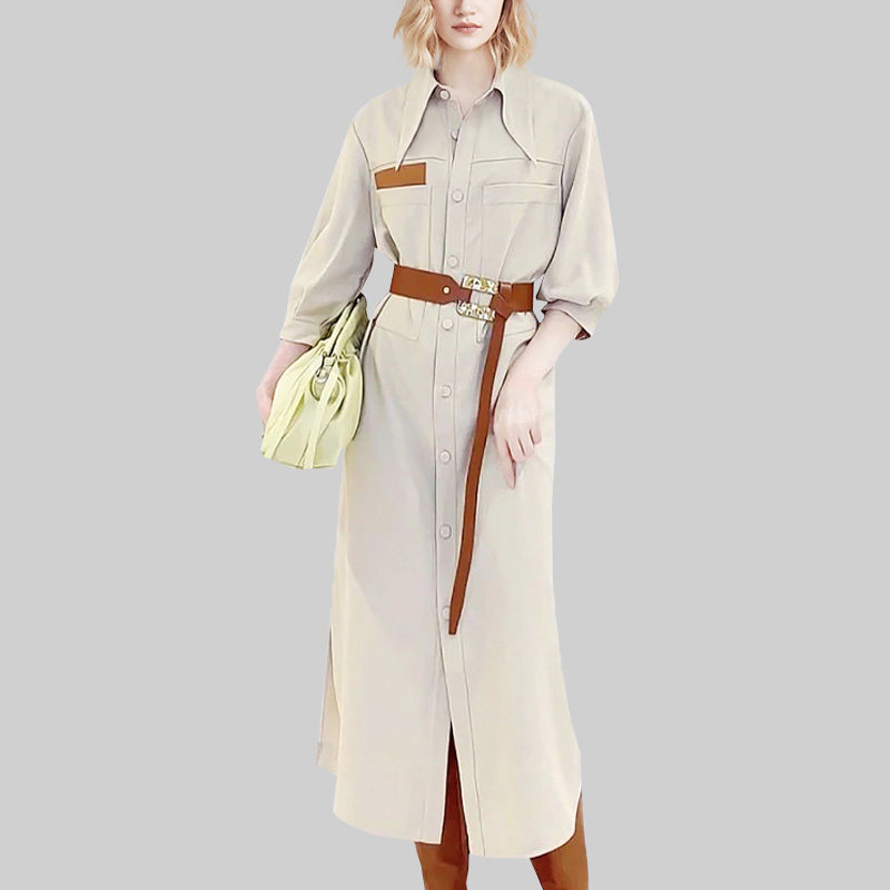 韩国chic秋季简约优雅翻领单排扣系带收腰长袖中长款百褶连衣裙女