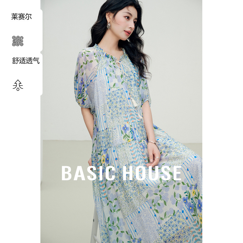 Basic House/百家好莱赛尔花朵连衣裙女夏季新款系带领中长款裙子