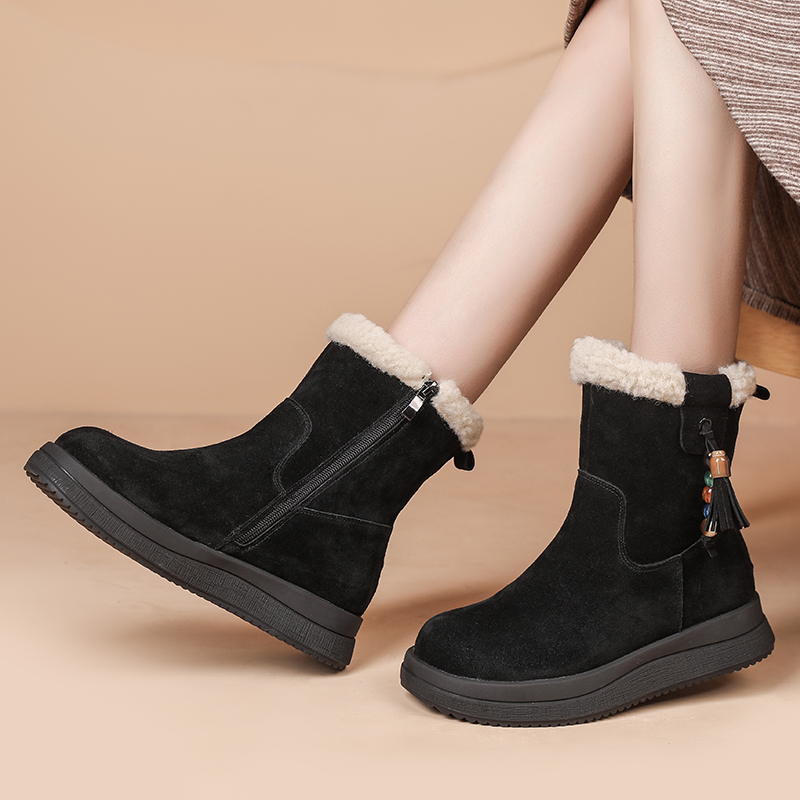 真皮大码女棉鞋35-41冬季新款韩版百搭厚底雪地靴流苏串珠短靴子