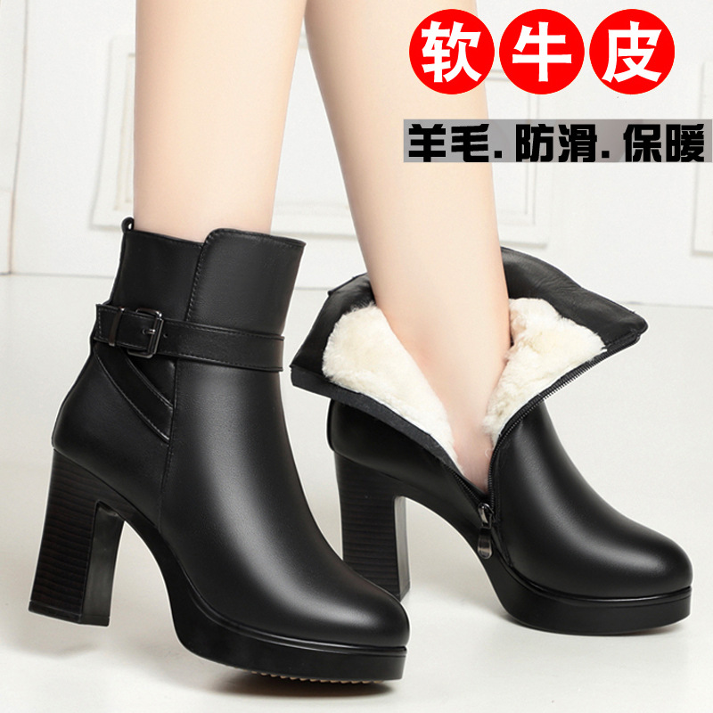 女士高跟短靴皮毛一体粗跟加绒加厚东北羊毛女靴子真皮大码女棉鞋