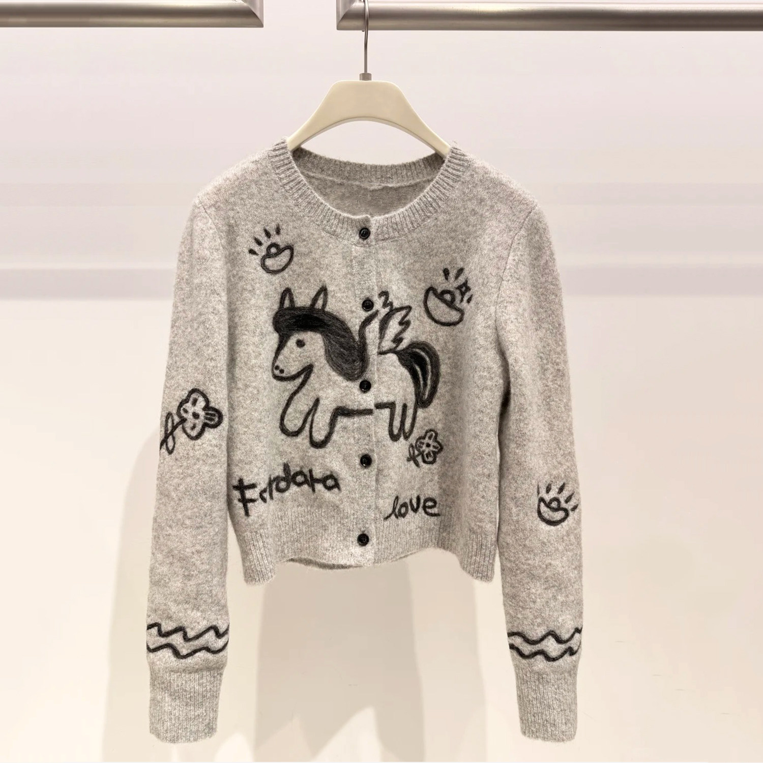 深圳南油高端女装2025冬新款童趣风小马刺绣灰色针织开衫毛衣外套