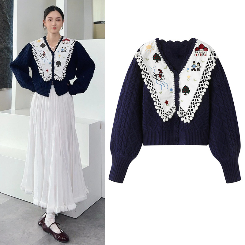 韩系童趣小众刺绣圆领长袖针织开衫女秋冬宽松毛衣外套设计感上衣
