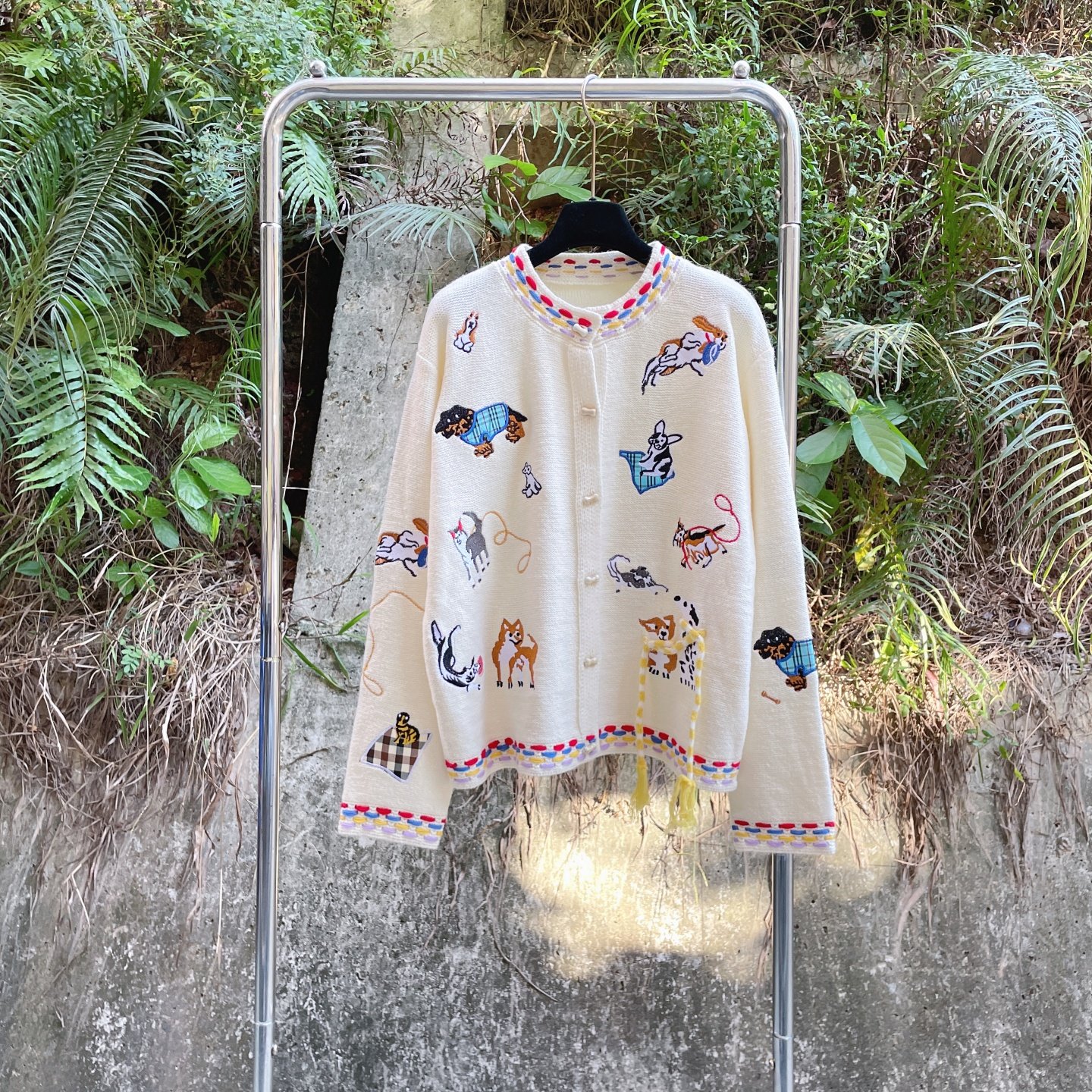 秋冬复古童趣小狗刺绣韩系软糯长袖毛衣外套宽松百搭羊毛针织开衫