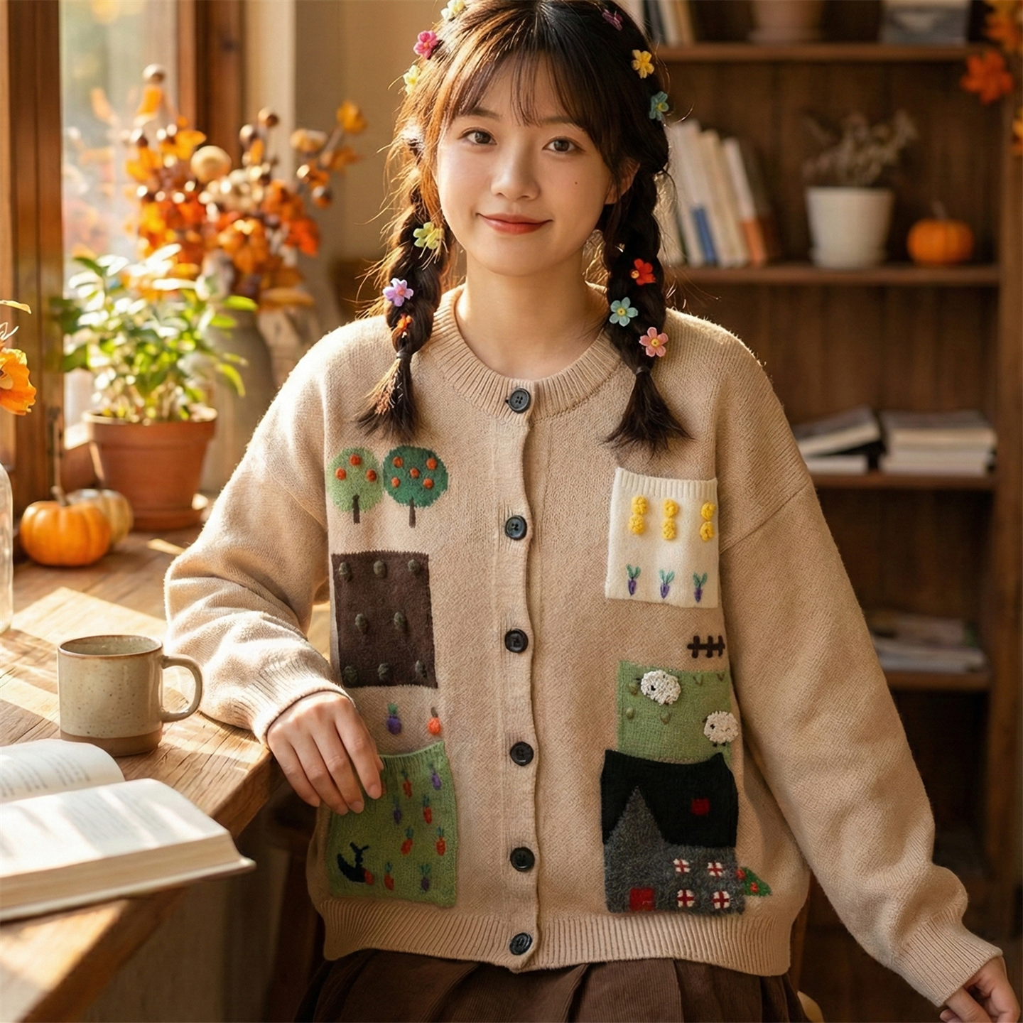 毛衣外套2025秋季新品童趣风景拼块毛织绞花圆领长袖短针织开衫女