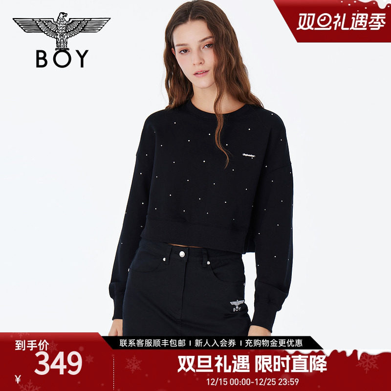 BOYLONDON春季女士短款上衣烫钻设计感圆领套头卫衣长袖W03001