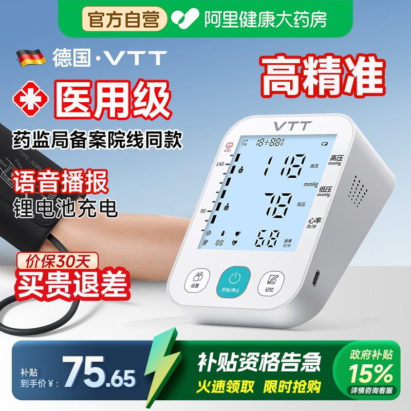 VTT电子血压计臂式高精准测量仪家用充电全自动高血压测血压医用
