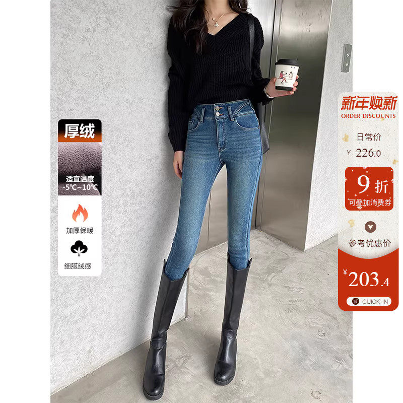 翘臀两粒扣高腰牛仔裤女秋冬新款植绒保暖修身显瘦提臀九分小脚裤