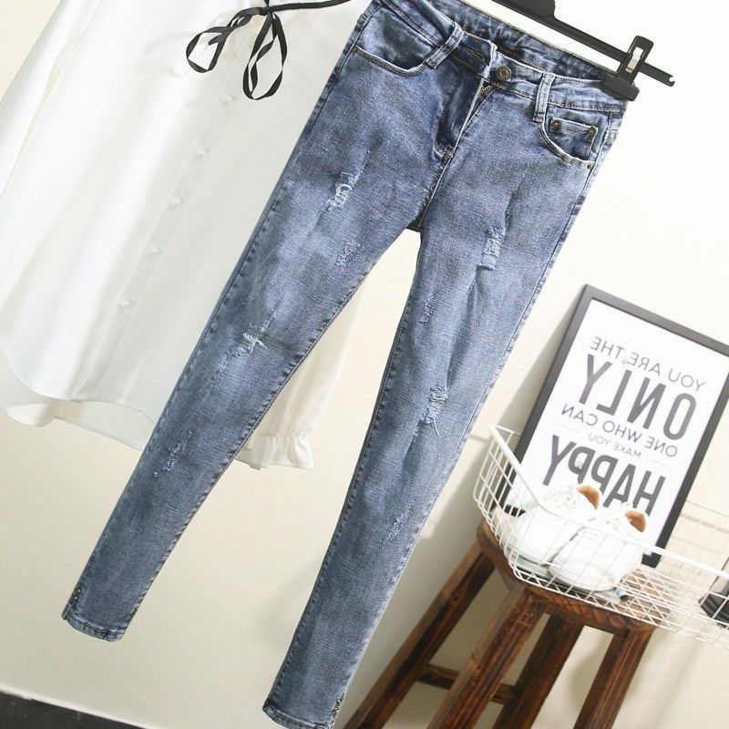 浅蓝秋冬新款显瘦弹力小脚铅笔裤修身牛仔裤女高腰牛仔裤韩九分裤