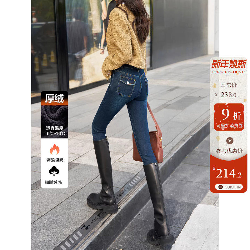 保暖显瘦加薄绒小脚牛仔裤女深蓝色两粒扣高腰修身显瘦九分铅笔裤