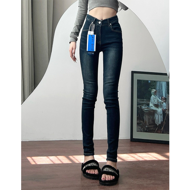 2025年秋冬高腰牛仔裤女修身显瘦深蓝小脚裤加绒墨蓝九分铅笔长裤