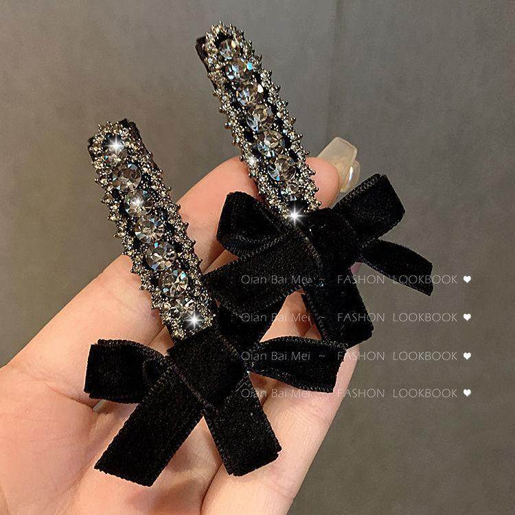 轻奢复古丝绒蝴蝶结发夹小香风灰色水钻高级感刘海夹一字夹边夹女