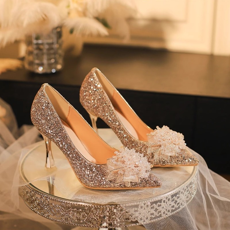 伴娘鞋女2025年春季新款时尚尖头水钻高跟鞋细跟女珍珠一字带凉鞋