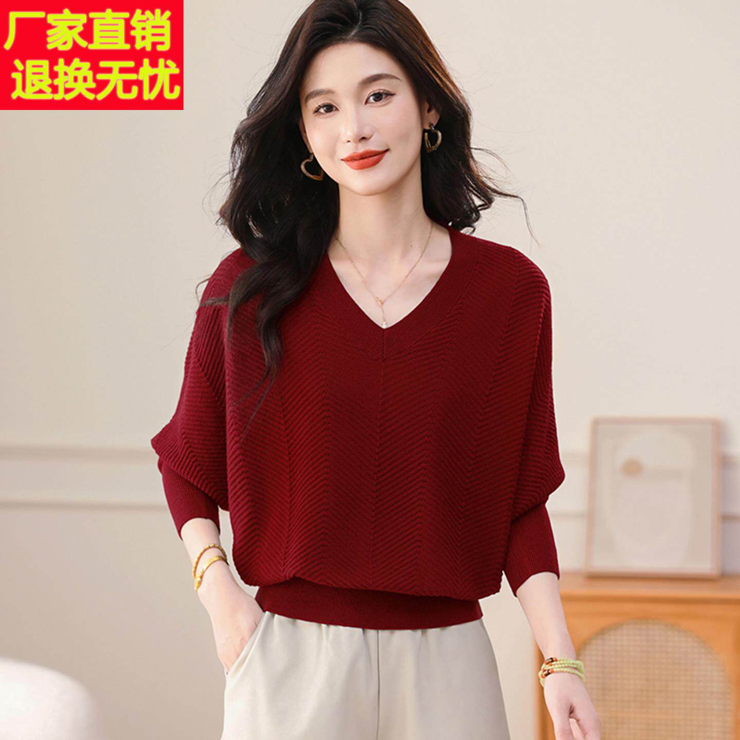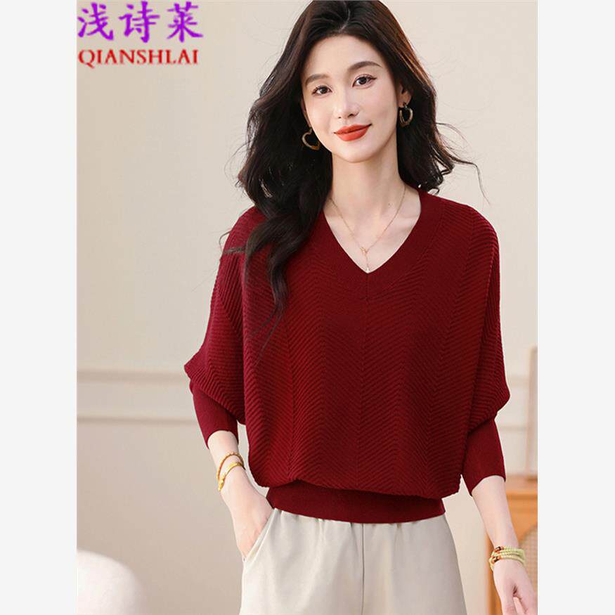 2025春秋新款蝙蝠衫韩版V领针织女休闲上衣宽松大码长袖外搭毛衣