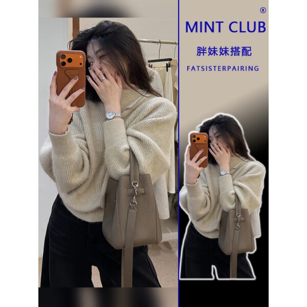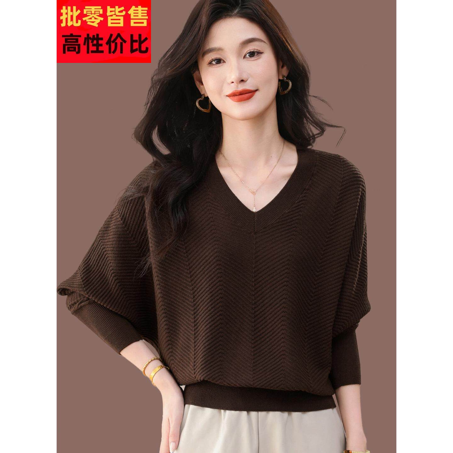 2026秋冬爆款蝙蝠袖韩版咖色毛领毛衣女宽松高级感软奶系针织衫
