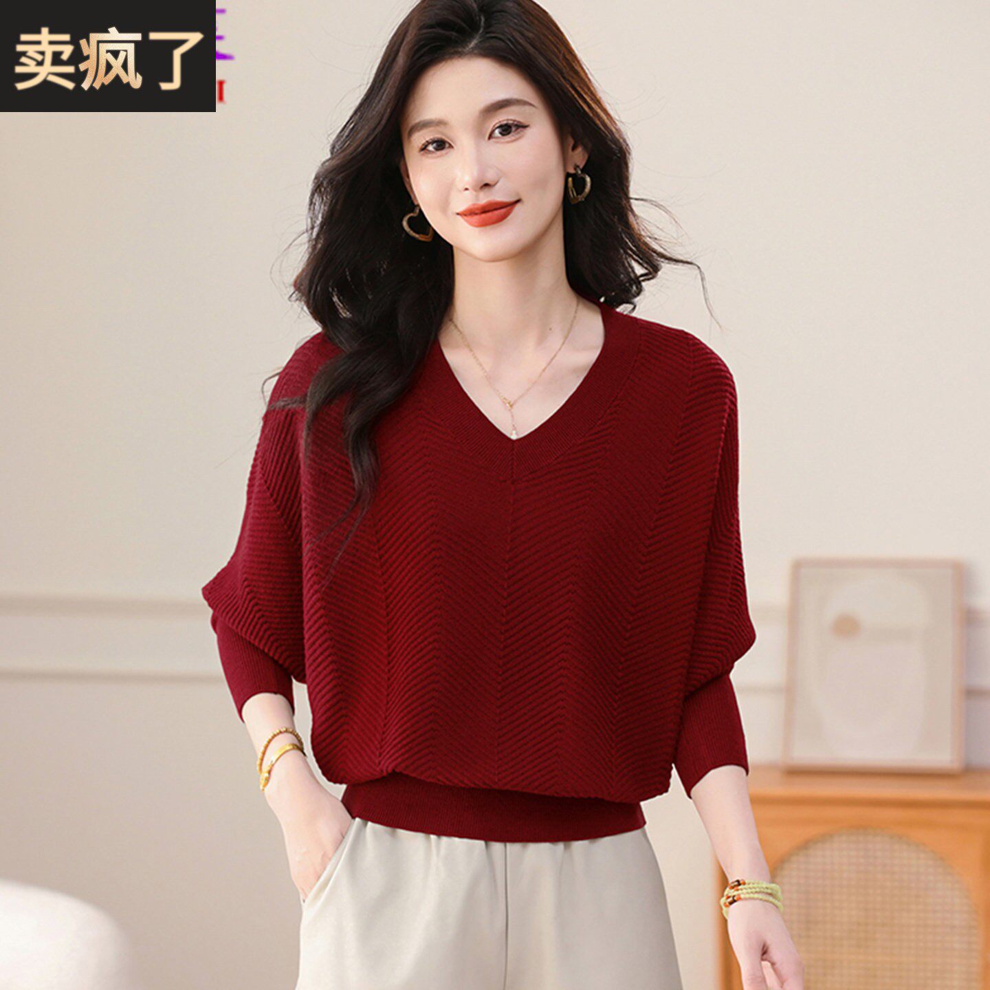 蝙蝠衫毛衣女士秋冬新款韩版V领红色针织衫上衣宽松遮肚子打底衫