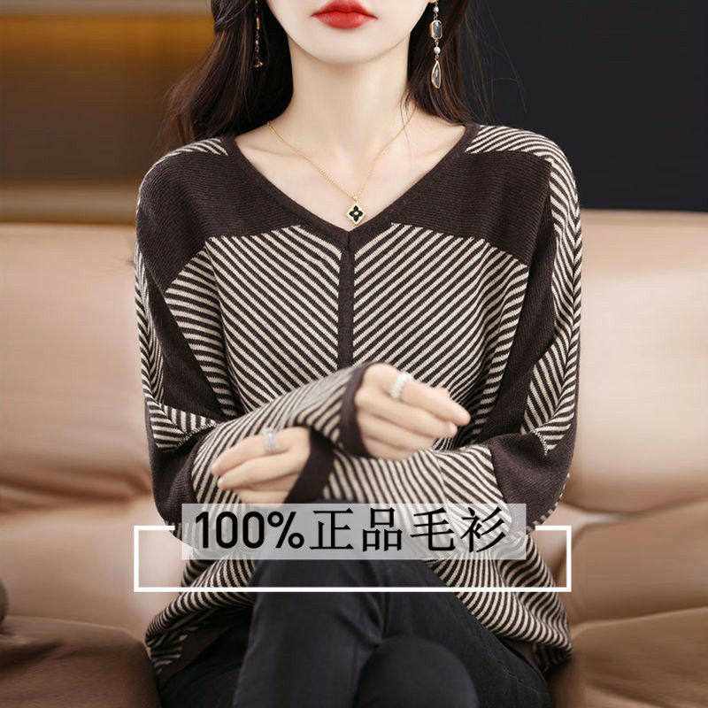 秋装蝙蝠衫V领拼色条纹大码毛衣女2024秋冬新款韩版宽松针织小衫