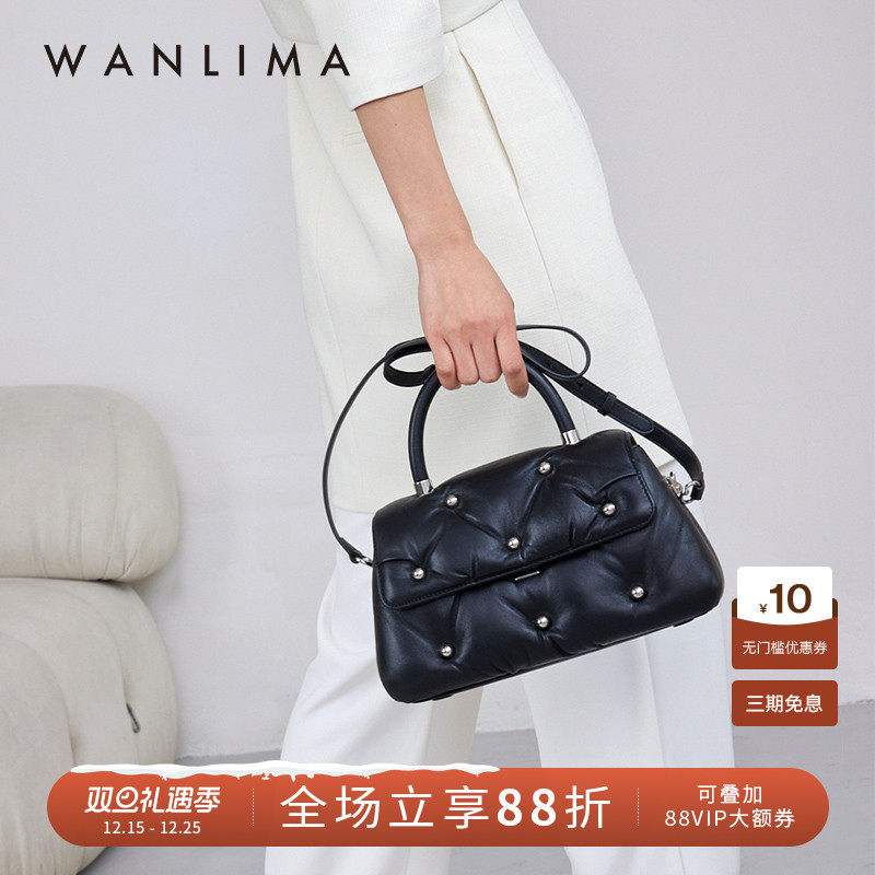 万里马新款铆钉软羊皮羽绒包绗缝菱格女包手提单肩斜跨质感小方包
