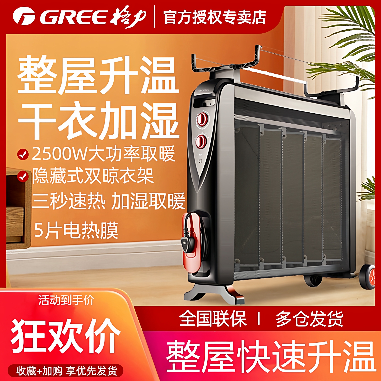 格力取暖器家用硅晶电热膜节能电暖器防烫独立加湿烤火炉双晾衣架
