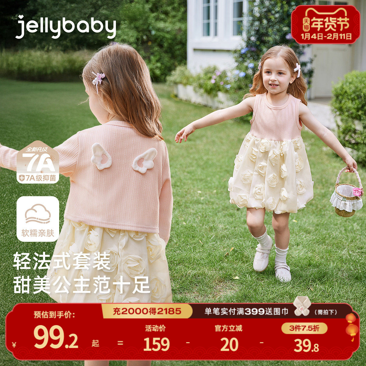 班喜迪女童连衣裙春装新款儿童公主裙子宝宝周岁礼服春秋抗菌套装