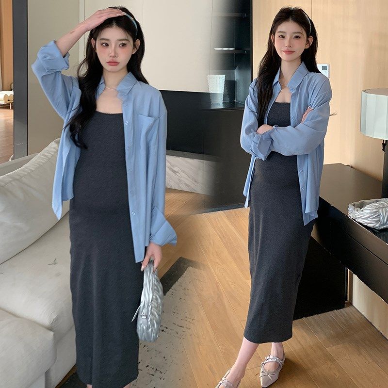 孕妇春装连衣裙2025新款孕期穿搭长袖衬衫背心公主裙子春秋季套装