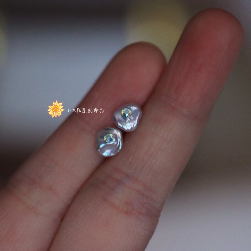 太阳原创设计s925天然银粉蓝珍珠施家钻耳钉超闪小巧养耳朵防过敏