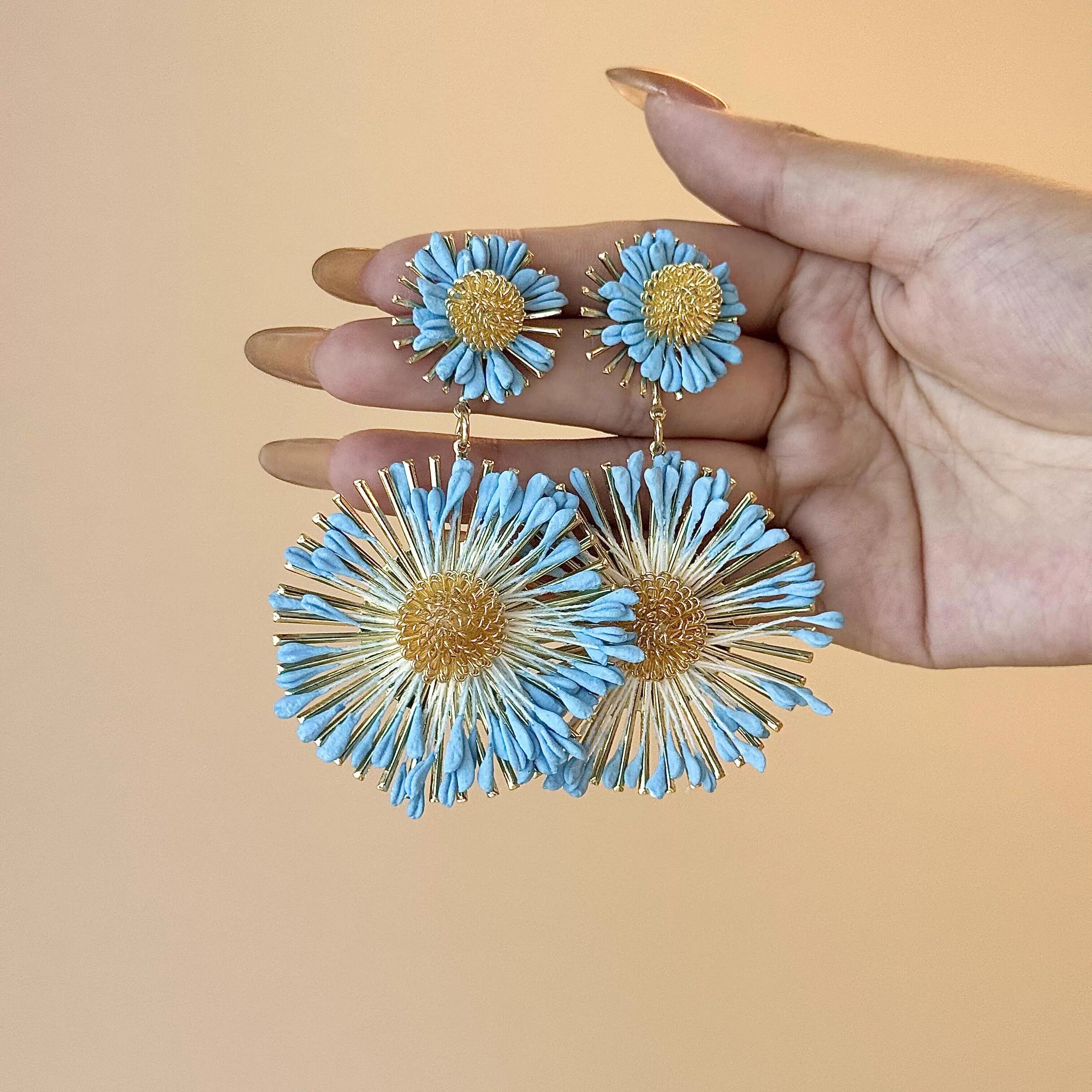 海边度假风蓝色草编太阳花朵耳环女夏季夸张气质耳钉沙滩拍照耳饰