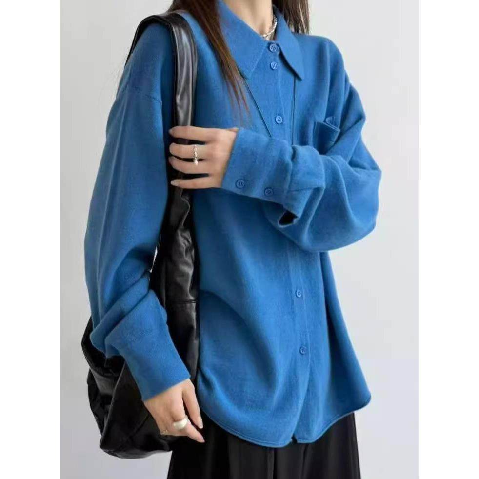 100%绵羊毛2025秋季新款衬衫款长袖纯色简约针织羊毛衫宽松上衣