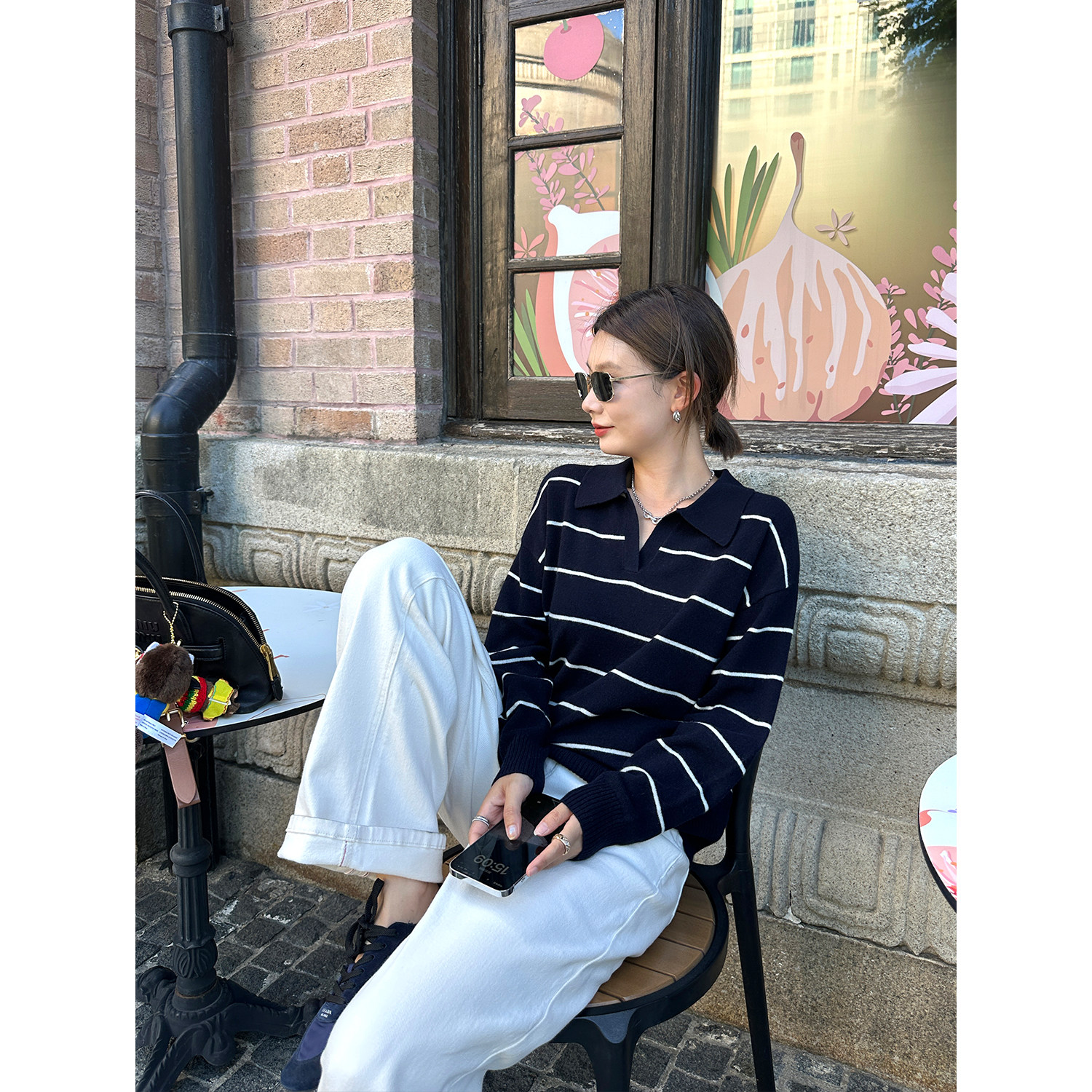 YANGLE_羊毛毛衣慵懒高级感2025年秋季新款宽松复古条纹针织衫女