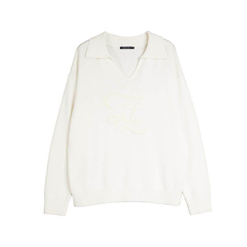 ELLE白色绵羊毛polo领针织衫女2025秋季新款套头宽松软糯通勤毛衣