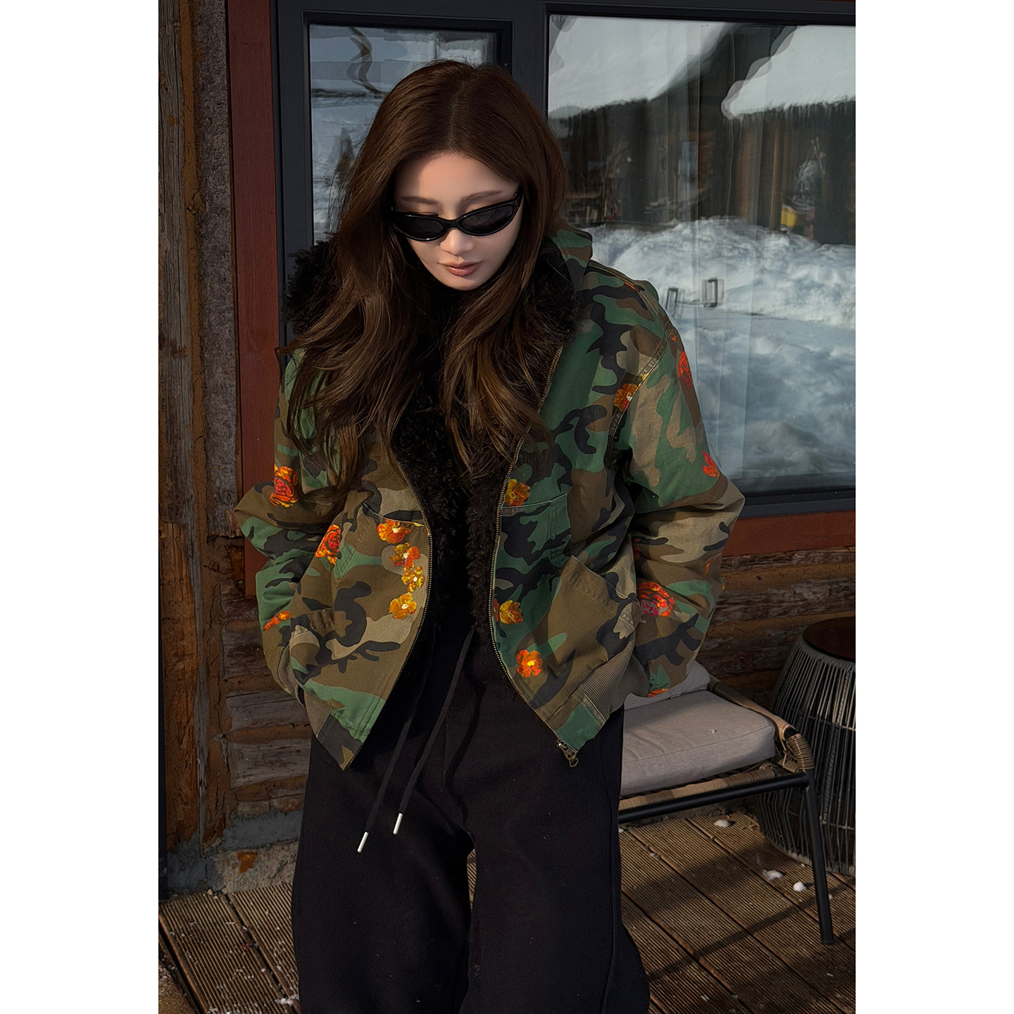 CHU楚妞[野序]纯棉加绒迷彩印花连帽短外套2025冬季新款女卫衣