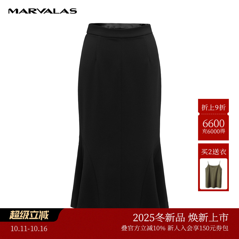 NEELLY纳俪商场同款秋季高腰黑色包臀鱼尾裙纯色垂感不规则半身裙