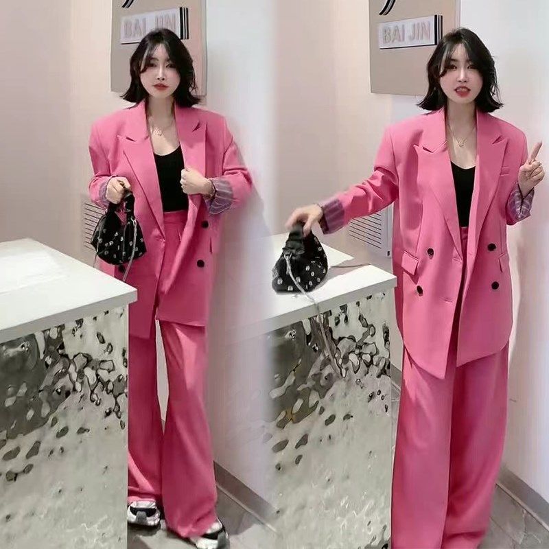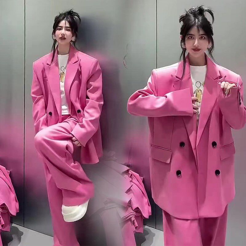 粉色西装套装女2024春秋新款高级感炸街西服外套阔腿裤休闲两件套