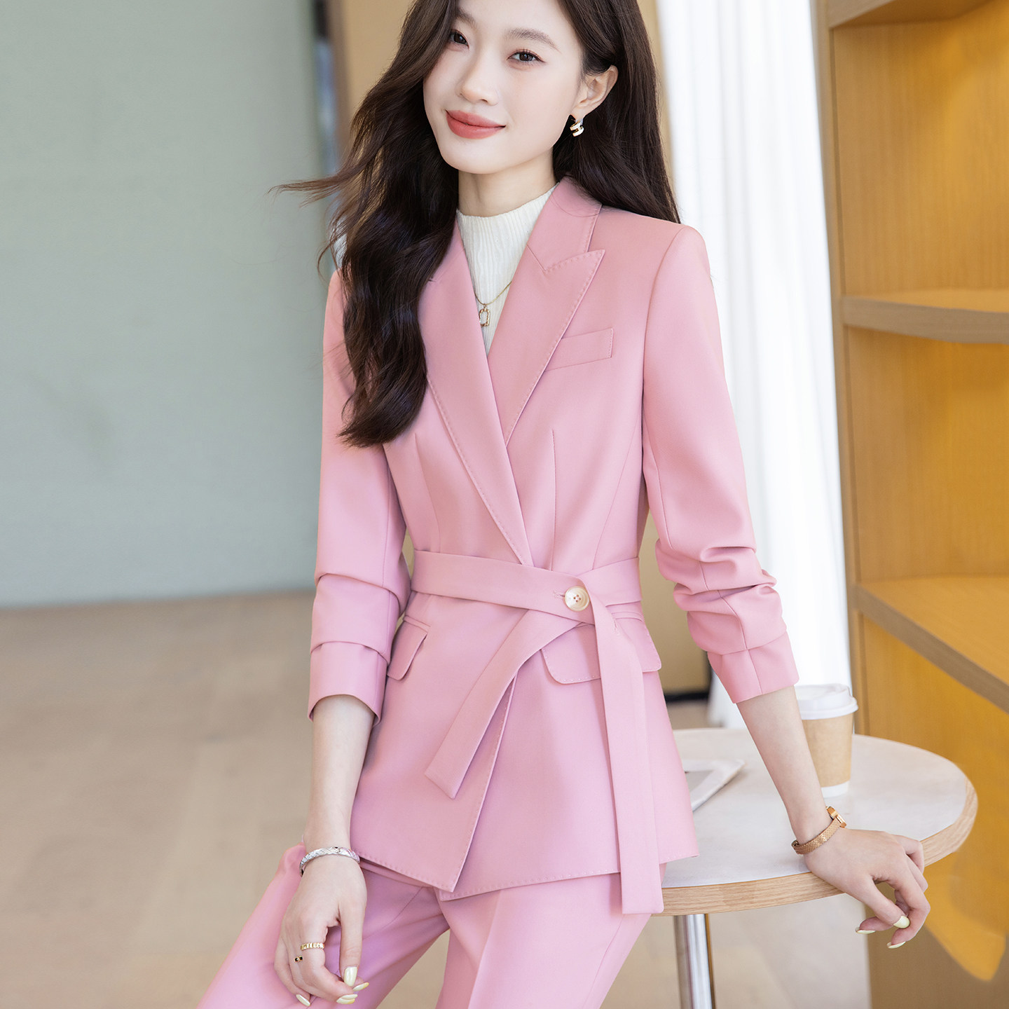 新款收腰显瘦粉色职业套装女装秋休闲西装套裙播音职场通勤工作服