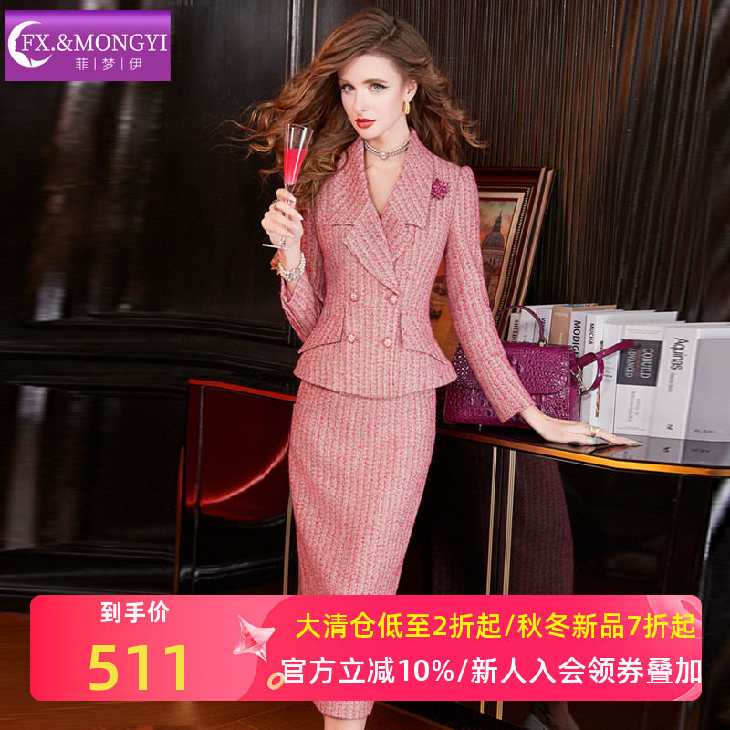 菲梦伊粉色小香风套装女冬季设计感名媛高端西装毛呢外套包臀半裙