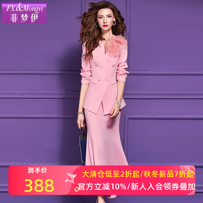 菲梦伊粉色西装时尚套装女秋季新款立体花朵设计感气质上衣鱼尾裙