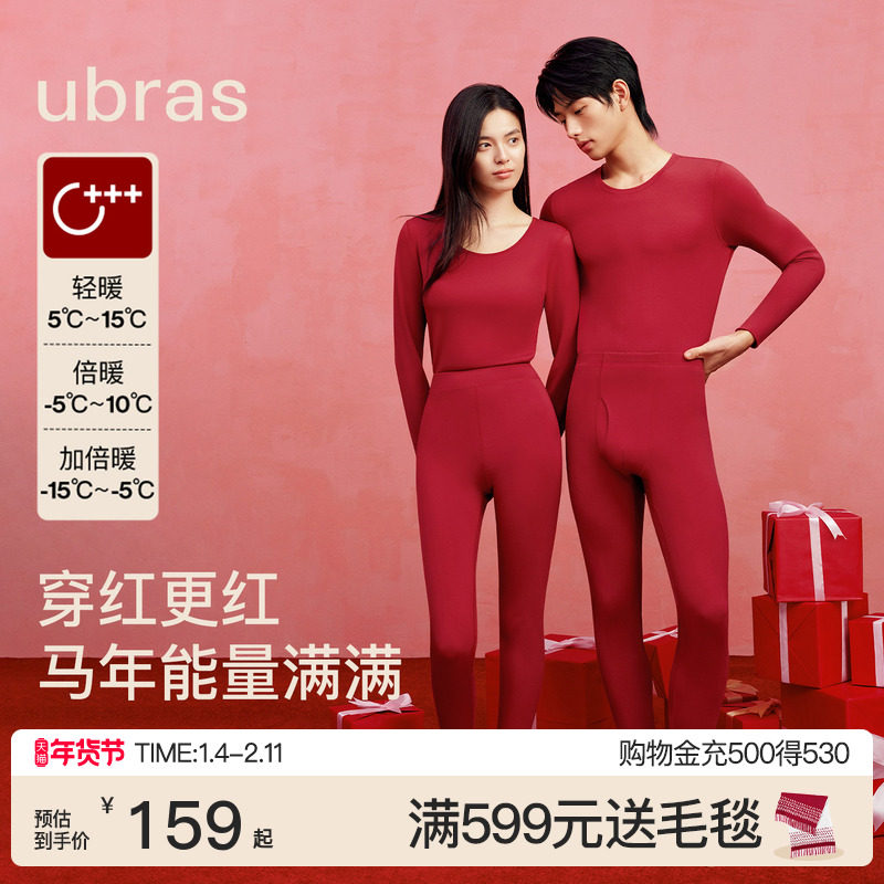ubras本命年红色加绒加厚含羊毛保暖内衣女套装新年开运秋衣裤男
