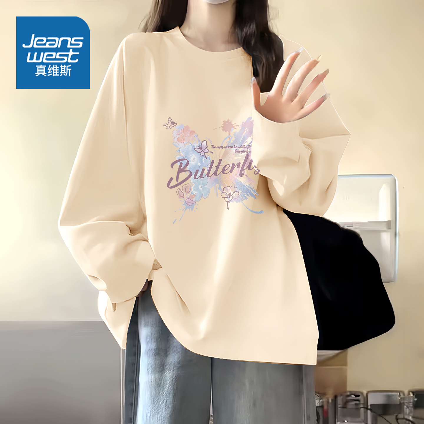 LB真维斯长袖t恤女2025新款秋季纯棉内搭打底衫中学生奶白色上衣